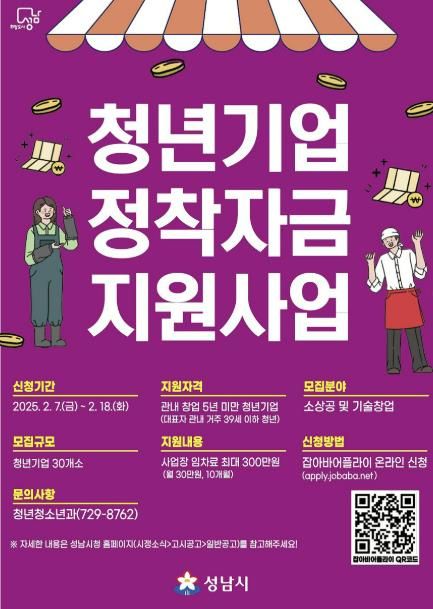 지원 대상은 19세~39세의 성남시민이면서 공고일(2월 7일) 기준 지역 내에 창업한 지 5년 미만인 기업 대표다.