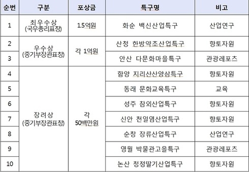 이날 행사에서, 10개 우수 지역특구는, 최우수상 1개와 우수상 2개, 그리고 장려상 7개로 특구운영성과에 따라 표창 및 포상금을 수여받았다.