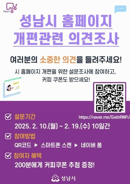 (비전21뉴스) 성남시는 오는 2월 19일까지 시 홈페이지 개편과 관련한 시민 온라인 설문조사를 한다.