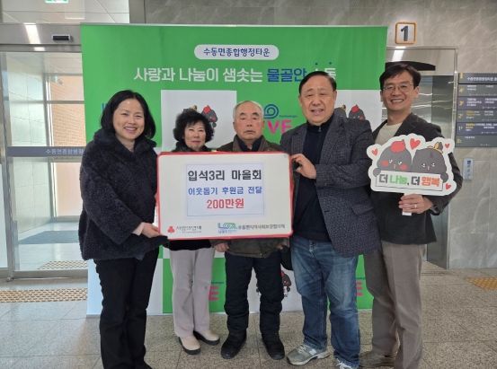 이진춘 수동면장은 “입석3리 주민들의 따뜻한 나눔이 어려움을 겪고 있는 가정에 큰 힘이 될 것”이라며 “수동면에서도 복지 사각지대 해소를 위해 최선을 다하겠다”고 말했다.