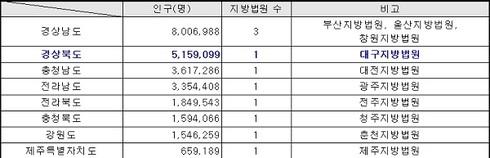 현재 우리나라는 대법원을 중심으로 전국에 5개 고등법원과 18개 지방법원이 있으며 서울고법에 9개, 부산고법과 광주고법에 각 3개, 대전고법에 2개의 지방법원이 있지만, 대구·경북을 담당하는 ‘대구고법에는 지방법원이 1개’ 뿐인 상황이다.