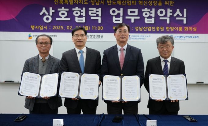 (비전21뉴스) 성남산업진흥원은 2월 24일 오전 11시 성남산업진흥원 이의준 원장, 전북특별자치도경제통상진흥원 윤여봉 원장, 가천대학교 반도체교육원 김용석 원장, 전북대학교 반도체 소·부·장 혁신융합대학사업단 이종열 단장 등 4개 기관 주요 관계자 20명이 참석한 가운데 성남산업진흥원 회의실에서 4者 업무협약 체결식을 진행했다.
