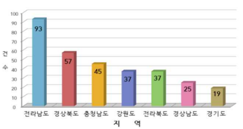 지역별로 지리적 표시 단체표장 등록현황을 보면, 전국 17개 광역시/도 중에서 전라남도가 ‘영광민물장어’, ‘완도멸치’ 등 93건으로 가장 많은 단체표장을 등록받았으며, 다음으로 경상북도가 ‘영덕대게’, ‘성주참외’ 등 57건, 충청남도가 ‘서산달래’, ‘서천김’ 등 45건을 등록받은 것으로 나타났다.
