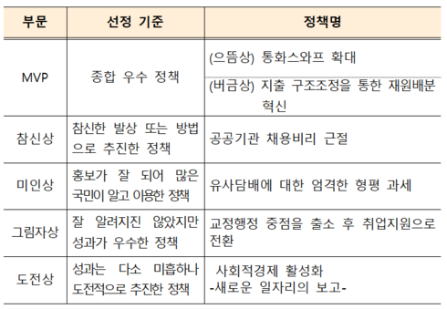 올해 '정책 MVP'는 총 24개의 후보정책을 대상으로 5개 분야에서 6개*의 우수 정책을 선정했다.