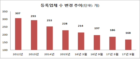상조업 일반 현황으로는 2017년 9월 말 기준 각 시 · 도에 등록된 상조업체는 168개로 동년 상반기 대비 18개 업체가 감소했다.