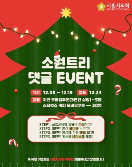 이벤트 참여 방법은 간단하다. 시흥시의회 공식 유튜브 채널을 ‘구독’하고 영상에 ‘좋아요’를 누른 뒤, 댓글로 나만의 소원을 작성하면 된다. 이후 영상 설명란이나 댓글에 게시된 방법을 통해 참여 인증을 하면 응모가 완료되며, 당첨자는 12월 24일 발표된다.
