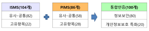 이번 통합 논의 과정에서 ISMS 인증항목 104개, PIMS 인증항목 86개에 대한 비교 검토 결과, ISMS 인증항목 82개(78.8%)가 PIMS 인증과 동일·유사하고, PIMS 인증항목 86개를 기준으로 볼 때 58개 항목이 동일·유사한 것으로 분석됐다.