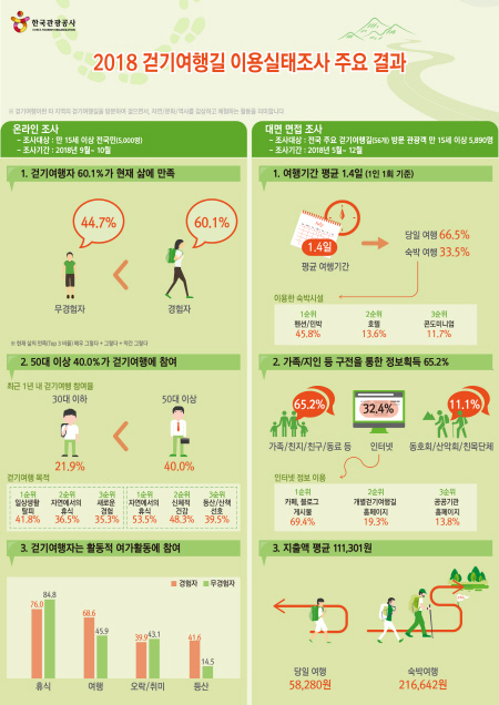 온라인 조사는 걷기여행 경험자와 무경험자 비교를 통해 걷기여행의 특성을 도출하기 위해 실시했다. 조사결과 걷기여행을 하는 사람들이 현재 삶에 더 만족하는 것으로 나타나 걷기여행과 국민 삶의 질 간의 밀접한 관련성을 확인할 수 있었다. 걷기여행자의 60.1%가 현재 삶에 만족하는 반면, 무경험자는 44.7%만이 만족한다고 응답했다. 또한 걷기여행자는 평소 활동적인 여가활동을 즐기는 성향을 보였다. 걷기여행자는 여행, 등산을 즐기는 반면, 걷기여행을 하지 않는 사람들은 휴식과 취미오락 활동 참여 비율이 높았다.