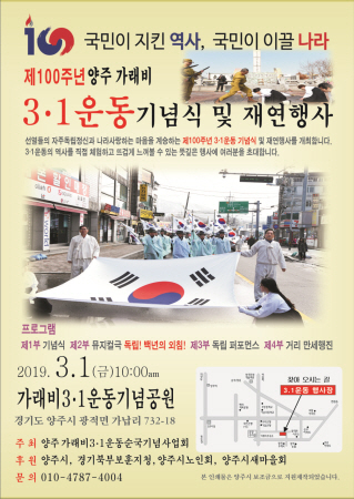 [비전21뉴스] 양주시는 오는 3월 1일 10시 광적면 가납리 가래비 3·1운동 기념공원에서 '양주 가래비 3·1운동 100주년 기념식'을 개최한다고 밝혔다.