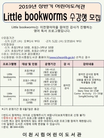 [비전21뉴스] 이천시립어린이도서관은 초등1학년, 초등2~3학년을 대상으로 원어민 선생님과 함께하는 2019년 상반기 Little Bookworms 영어 독서교실을 운영한다.