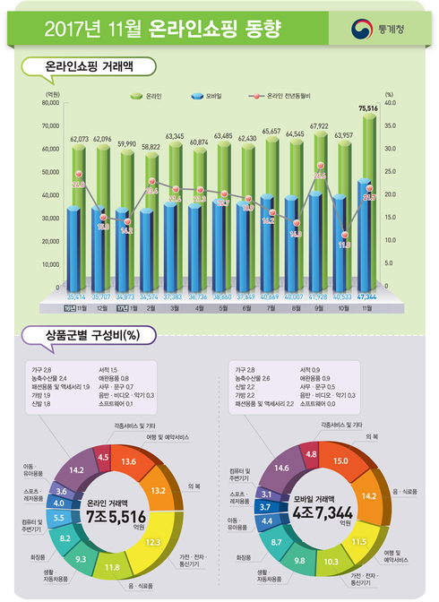 온라인쇼핑 중 모바일쇼핑 거래액은 간편결제의 편리성 등으로 전년동월대비 33.7% 증가했으며, 취급상품범위별 거래액은 전년동월대비 종합몰 8.5%, 전문몰 15.1% 각각 증가했다.