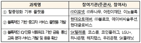 민간 전문가로 구성된 평가위원회를 통해 실현가능성, 블록체인 적용에 따른 개선 정도 등을 면밀히 평가해 이중 3개 컨소시엄을 우선협상대상자로 선정하였으며, 기술협상을 거쳐 3월 중순 협약 체결을 거쳐 총 87억원 규모의 프로젝트가 시작될 예정이다.