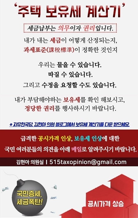 김현아 의원은 “세금납부는 의무이자 권리임에도 우리는 내가 내는 세금이 어떻게 산정되는지 과세표준은 정확한지 모른 채 납부 의무만을 강요받고 있다”며 “공시가격 급등에 따라 내가 부담해야 하는 보유세를 확인하고, 과세표준이 적정한지 묻고 수정할 수 있는 정당한 권리를 행사할 수 있도록 주택 보유세 계산기를 제작했다”고 취지를 설명했다.