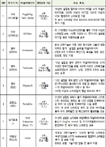 중소벤처기업부는 “국가별 현지 액셀러레이터를 통해 차별화된 진출 프로그램을 제공해 창업기업이 목표로 하는 현지시장의 니즈를 반영한 제품 개발과 시장기회를 발견하고 활용할 수 있도록 창업기업의 글로벌 역량을 강화하고 성공적인 해외진출을 지원하겠다.“고 밝혔다.