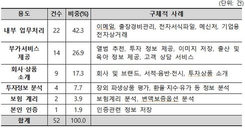 활용 용도로는 개인정보를 처리하지 않는 내부 업무처리가 22건(42.3%)으로 가장 많고, 대고객 부가서비스 14건(26.9%), 회사·상품 소개 9건(17.3%), 투자정보 분석 4건(7.7%) 등의 순으로 이어졌다.