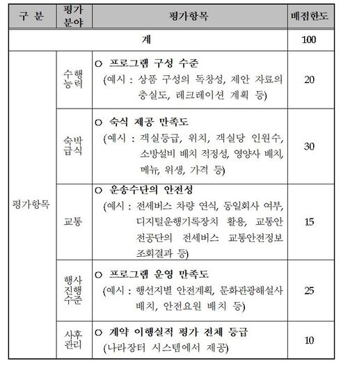 여행프로그램 구성수준, 숙식제공 만족도, 운송수단의 안전성, 프로그램 운영 만족도 등을 평가하고 가격은 평가요소에서 제외했다.