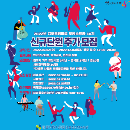 (비전21뉴스) (재)김포시청소년재단 중봉청소년수련관은 김포드림마루 오케스트라 신규단원을 오는 2월 16일부터 추가 모집한다고 밝혔다.