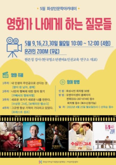 이번 화성인문학아카데미는 ‘영화가 나에게 하는 질문들’이라는 주제로 5월 9일부터 5월 30일까지 매주 월요일(총 4회), 10:00~12:00(2시간) 쌍방향 온라인 줌(zoom)으로 진행된다.