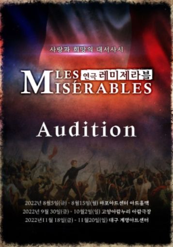 연극 '레미제라블'에 출연할 팡틴, 마리우스, 코제트, 앙졸라, 에포닌 등 배우 오디션을 실시하며 지원서류는 5월11일까지이다.