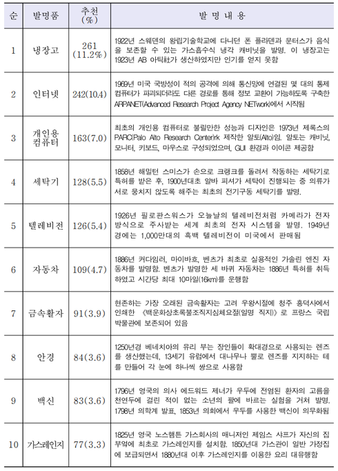 뒤를 이어 6위는 자동차, 7위는 금속활자, 8위는 안경, 9위는 백신, 10위에는 가스레인지가 뽑혔다.