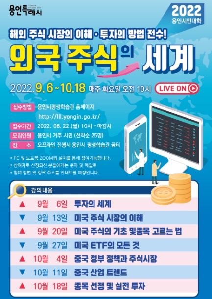(비전21뉴스) 용인특례시가 제32기 용인시민대학 하반기 강좌로 ‘외국주식시장의 이해’를 선정해 온라인 교육을 진행한다고 25일 밝혔다.