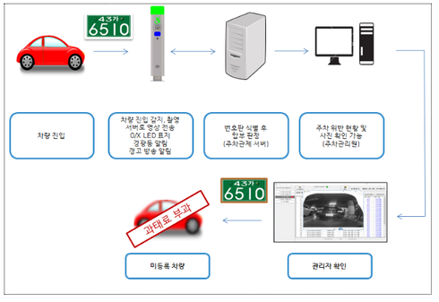장애인 주차구역에 차량이 접근할 경우 자동차 번호판을 촬영하여 주차관제시스템에 전송한 후 일반차량인 경우 일반주차장으로 차량 이동을 유도하고 차량이 이동하지 않을 경우 촬영된 번호판을 과태료 부과를 위한 증빙자료로 활용할 수 있도록 서비스를 제공한다.