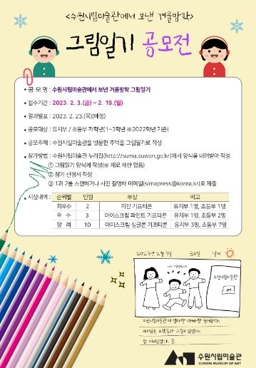 총 15명의 수상자를 선정해 치킨, 아이스크림 등의 기프티콘을 제공하며 수상작은 수원시립미술관의 홍보 관련 자료로 활용된다. 공모전 참여는 수원시립미술관 누리집 새소식에서 그림일기 양식과 신청서를 내려받아 작성 후 이메일로 2월 19일(월)까지 접수하면 된다.