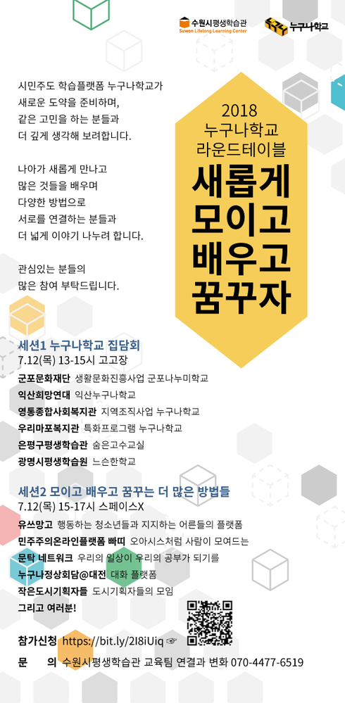 수원시평생학습관 관계자는 “누구나학교 라운드테이블에서 시민주도 학습모델을 평생학습 계로 확산할 방안을 모색할 수 있을 것”이라고 말했다.