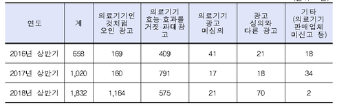 위반 유형별로는 공산품 등을 질병 예방·치료 효과 등을 표방하며 의료기기인 것처럼 광고 1,164건 의료기기 효능·효과를 허가받은 내용과 다르게 거짓 또는 과대광고 575건 심의 받은 내용과 다르게 광고 70건 등이다.