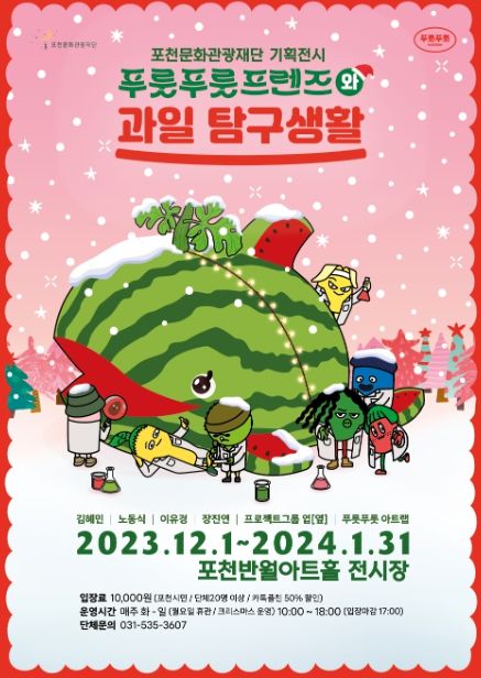 (비전21뉴스) 포천문화관광재단은 1일부터 2024년 1월 31일까지 포천 반월아트홀 전시장에서 푸룻푸룻프렌즈와 과일탐구생활 전시를 개최한다고 밝혔다.