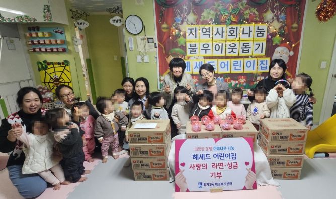 (비전21뉴스) 수원시 장안구 정자동에 위치한 헤세드어린이집이 20일, 이웃과 함께하는 따뜻한 연말을 보내기 위해 아이들과 함께 모은 사랑의 라면 200개와 성금 약 20만원을 정자3동 행정복지센터에 기탁했다.