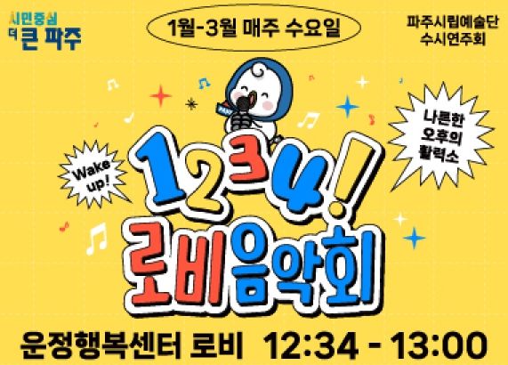 조동문 문화예술과장은 “로비음악회는 답답한 객석이 아닌 시민들이 많이 이용하는 운정행복센터 로비에서 여유롭게 즐길 수 있는 공연으로, 많은 시민들이 즐길 수 있도록 앞으로도 다양한 장소로 찾아가는 공연을 추진하겠다”라고 말했다.