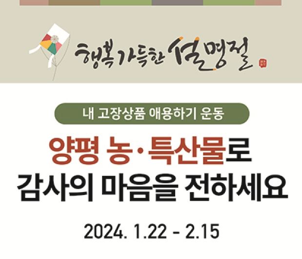 군 관계자는 “행사기간 동안 양평에서 생산된 우수한 농특산물을 엄선해 ‘양평 농특산물 설 선물전’을 준비하고 있다”면서 “많은 분들이 양평 농특산물을 애용해주시기 바란다”고 말했다.