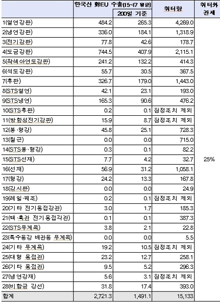 철강 세이프가드 조치가 불가피한 경우, EU내 투자한 우리기업의 생산에 필수적인 철강제품에 대한 적용 예외, 국별 쿼터, 쿼터 물량 확대를 요청했다.