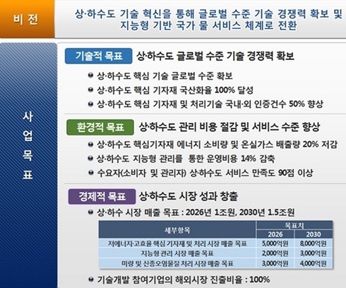 사물인터넷을 활용한 상하수도 관망의 누수, 수질과 유량 등 실시간 측정 기술, 정수장 및 하수처리장 자동 제어 및 최적 운영시스템, 빅데이터를 활용한 수돗물 정보서비스 제공 등 8개 기술과제로 구성됐다.