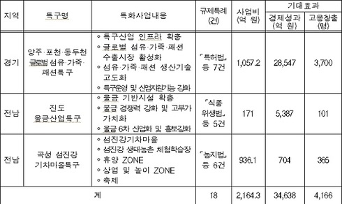 금번 신규 지정 및 계획변경된 지역특구에는 특화사업관련 특허출원의 우선 심사 등 총 18건의 규제특례가 적용되어, 해당 지역의 특화산업 발전을 제도적으로 뒷받침하는 한편, 향후 5년간 국비·지방비·민간자금 등 2,164억원의 사업비가 투자되어 4천여 명의 신규 일자리 창출과 3조 4천억원 규모의 경제적 파급효과 발생이 기대된다.