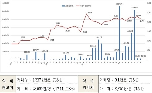배출권의 톤당 평균 거래가격은 2015년 1만 2,028원에서 2016년 1만 7,367원, 2017년 2만 1,131원으로 증가세를 보였으며, 3년간 평균가격은 2만 374원으로 집계됐다.