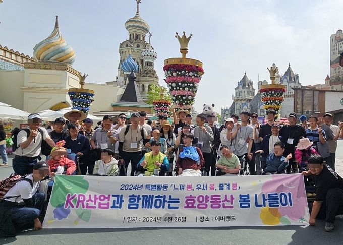 이날 행사는 효양동산의 장애인, 종사자, 봉사자(KR산업)들이 함께 에버랜드에서 놀이기구 탑승과 동물원 관람, 꽃 구경을 하며 즐거운 시간을 보냈다.