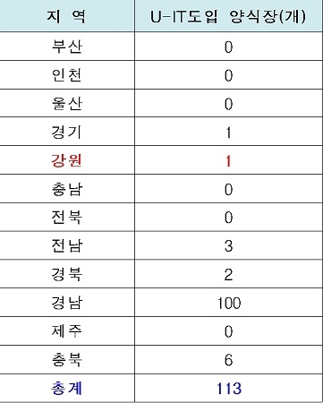현재 정부에서 지자체 보조사업으로 추진하고 있는 스마트양식 1단계 수준에 상응하는 ‘수산u-IT사업’은 개별 양식장에 스마트 센서와 모니터링 프로그램을 지원하고 있다. 현재 동사업은 전국 113개 양식장에 보급되어 있는데, 이 중 강원도는 단 한 곳뿐인 것으로 드러났다.