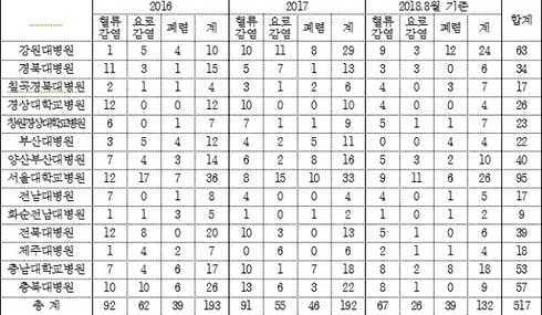 특히, 논란이 됐던 강원대학교병원의 경우 201.8월말 기준으로 24건이 발생해, 2017년 29건에 육박하고 있어 제대로 된 조치가 이뤄지고 있는지 의문이다.