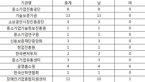 중소기업진흥공단, 기술보증기금, 소상공인시장진흥공단, 중소기업연구원, 공영홈쇼핑 등 11개 기관에서 여성 임원은 찾아볼 수 없었고, 장애인기업종합지원센터만 유일하게 임원 11명 중 1명의 여성 임원이 존재했다.