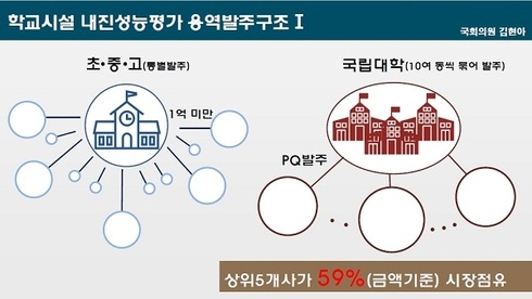 올해 국립대학교 내진성능평가현황을 살펴보면 전체 1,171개동, 금액 기준 256억 원의 내진성능평가가 발주됐으나 이중 5개 상위 업체가 약 60%에 해당하는 661개동, 151억 원의 물량을 수주했다.
