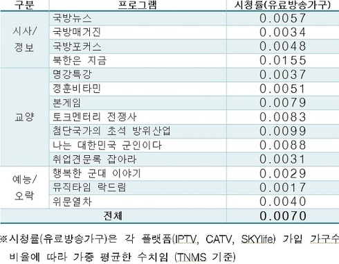 국회 국방위원회 김중로 의원이 국방홍보원으로부터 받은 자료에 따르면 국방홍보원은 지난해 방송제작으로 총 122억원이 편성됐고 이 가운데 국방 TV와 위문열차 제작에 90여억원이 투입됐지만 평균 시청률이 0.007%를 기록한 것으로 드러났다.