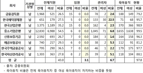 금융위원회 산하 및 출연기관의 전체 직원 중에 여성이 차지하는 비율은 평균 43% 정도였다. 여성직원의 비율이 가장 많은 곳은 중소기업은행으로 전체 직원의 55%를 차지했고, 주택금융공사 37%, 한국산업은행이 35.2%로 뒤를 이었다. 여성직원의 비율이 가장 낮은 기관은 금융감독원으로 전체 직원의 26%만 여성이다.