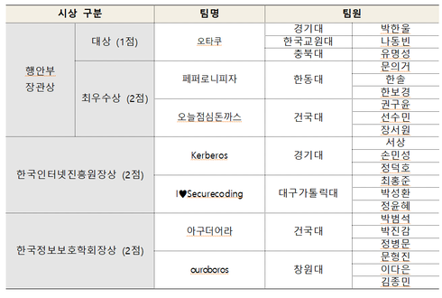 웹사이트 분야 대상을 수상한 ‘오타쿠’팀의 박한울, 나동빈, 유명성군은 “실제 소스코드를 살펴보며 보안약점과 취약점을 면밀하게 진단해 볼 수 있는 좋은 기회였고 앞으로도 안전한 사이버 세상을 위해서 더욱 노력 하겠다.”라고 소감을 밝혔다.