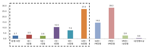 우리나라 전체 5,178만 명 중 32.6%인 1,690만 명이 토지를 소유하고 있으며 이는 ‘12년에 비해 158만 명이 증가하였으나, 상위 50만 명의 소유비율은 1.3%포인트 감소된 53.9%로 나타났다.