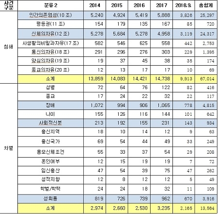 또 지난 5년간 접수된 진정건수는 총 5만1825건으로 이중 침해가 4만32건으로 77.2%를 차지했고, 차별은 1만1659건으로 22.5%를 차지했다.