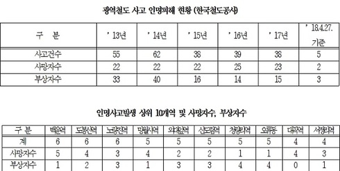 이찬열 의원이 한국철도공사로부터 제출받은 자료에 따르면, 지난 2013년 이후 올해 4월까지 광역철도에서 총 237건의 사고가 발생했고, 116명이 사망했다. 부상자수도 121명에 달했다. 역별 사상자수는 백운역, 도봉산역, 노량진역이 각각 6건으로 가장 많았고, 이어 망월사역, 외대앞역, 신도림역, 청량리역, 오류동역이 각각 5건으로 그 뒤를 이었다.