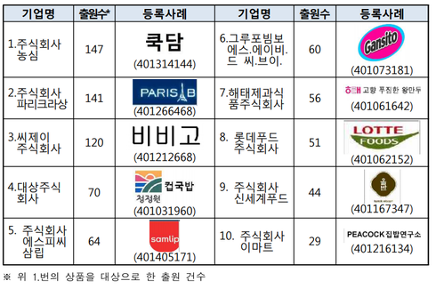 출원인 유형별로는, 기업이 3,737건으로 3,080건을 출원한 개인보다 다소 많았고 주요 기업을 살펴보면 1위는 147건을 출원한 ㈜농심, 2위는 141건을 출원한 ㈜파리크라상에 이어 ㈜씨제이, ㈜대상, ㈜에스피씨삼립 순으로 조사됐다.