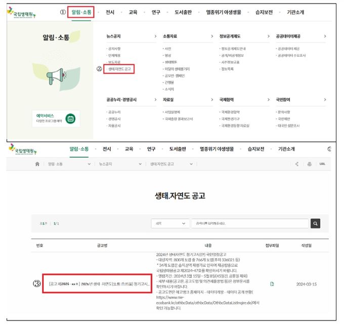 (비전21뉴스) 환경부는 ‘2025년도 생태ㆍ자연도 정기고시(안)’을 3월 10일부터 4월 30일까지 국립생태원 누리집을 통해 공고한다고 밝혔다.